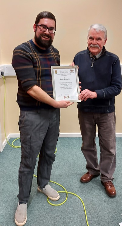 The presentation of the certificate was made by our President Col Roger Herriot OBE, DL to Ed Sewells MBE, Assistant County Commissioner.