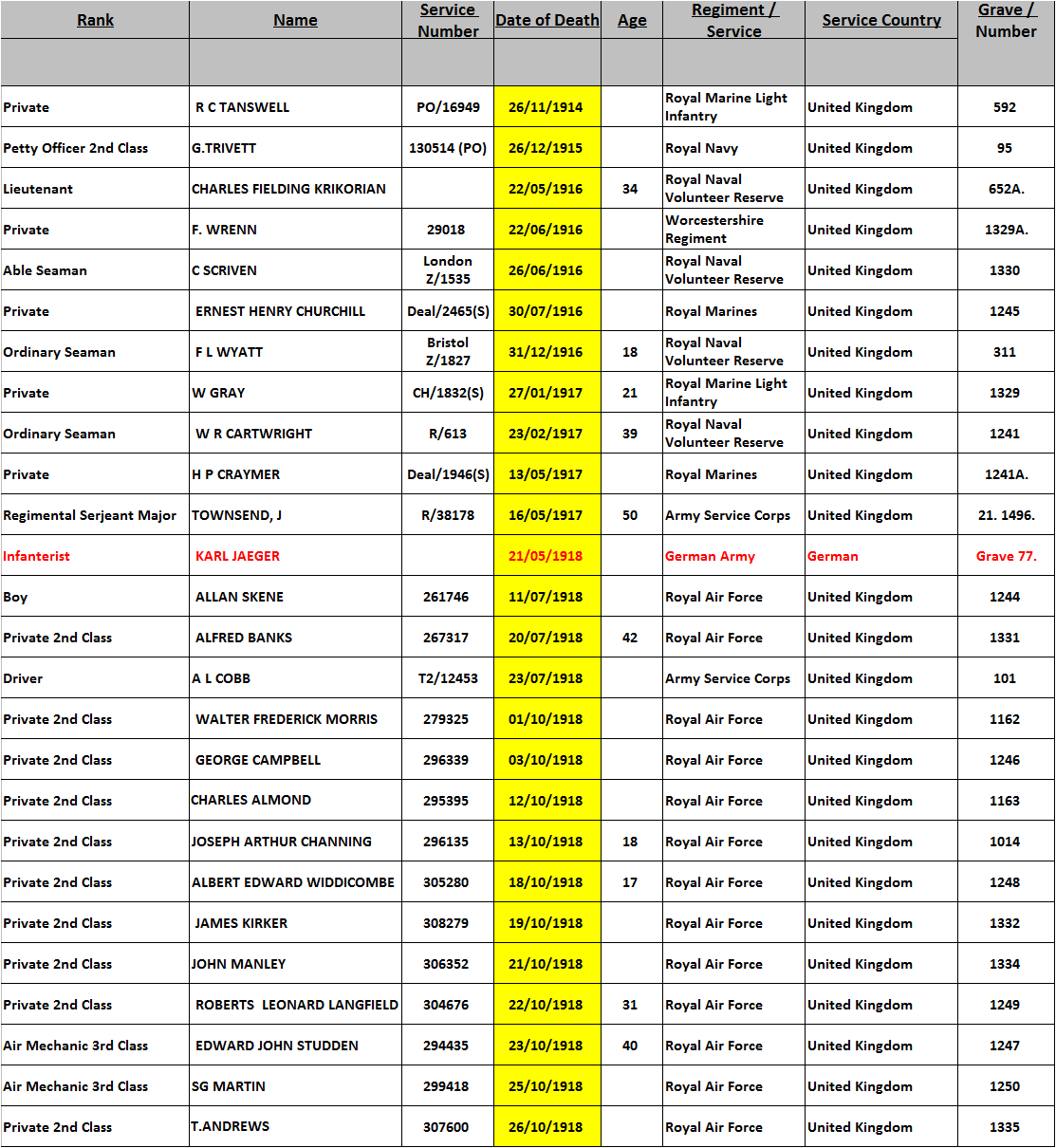 The list is in a chronological order of date of death with the Great War coloured in yellow and the World War 2 in blue.