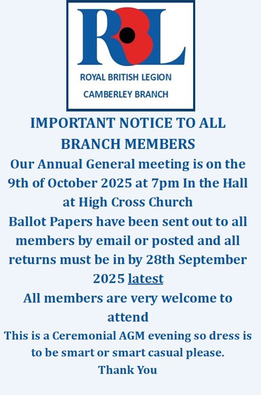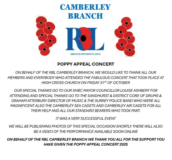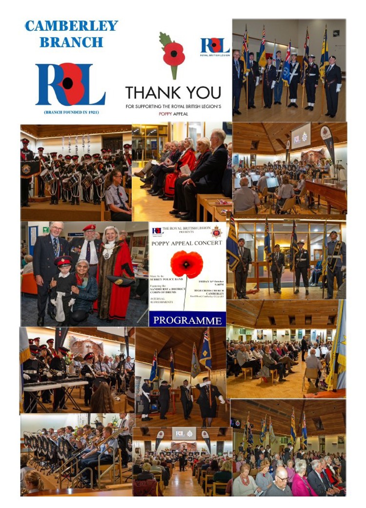 Our very popular annual 'Poppy Concert' featuring the fabulous 'Surrey Police Band' will be held on Friday evening on the 31st October. This year it will be held in the Camberley Town Centre, at the new venue this year, which is at High Cross Church.