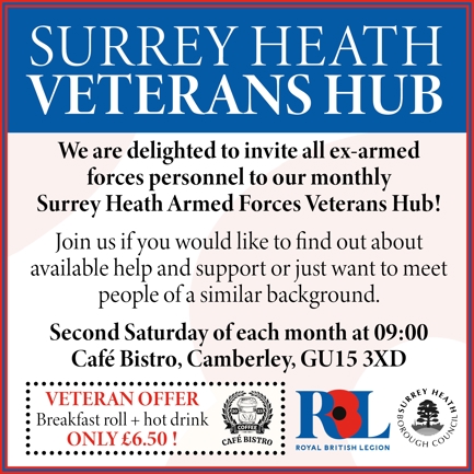 Surrey Heath Borough Council together with RBL Camberley Branch are holding more 'Veterans Hub' Breakfast's at Café Bistro GU15 3XD Every 2nd Saturday of the month