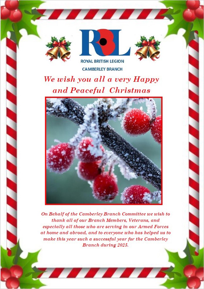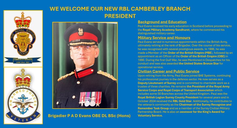 To all members of the RBL Camberley Branch and to all colleagues’ friends and associates on behalf of the committee it is my privilege and great honour to be able to announce the appointment of our new President for our Branch. Brig. P A D Evans O.B.E DL BSc (Hons). Paul has been a member of the branch for some 15 years. I hope you will all join me in welcoming Paul who has accepted to become our new President. This is very important for the Branch and a great Honour for us to have Paul as our figurehead.