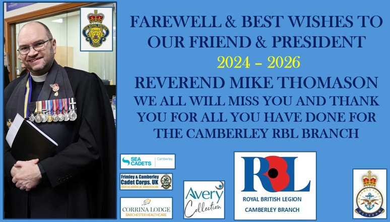 Reverend Mike Thomason our President, veteran member and Branch Chaplain, is leaving us to take up a new post in the North of England where he will be taking on the role of managing the diocese around the Manchester area. Mike who was a major player in the Branch and helped with restabilising the Branch within the local community, will be sadly missed by us all. We wish Mike every success for the future for him and his family. Thank you for all you have done for the Camberley Branch