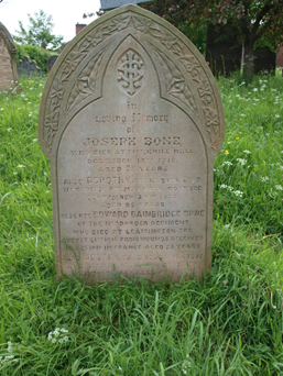 Pte Edward Bainbridge Bone, a local farmer and the son of Joseph and Dorothy Bone, of Monkhill Hall Farm. Edward was seriously wounded in the fighting on the Somme during August 1916 and died in a military hospital in Leamington Spa in Warwickshire on 21st August 1916. He was 28 years old. His remains were returned to his parents and he is interred here in the family grave in the ancient burial ground of Kirkandrews-on-Eden. He served with 11th (Lonsdales) Bn Border Regt. The old churchyard, on the direct road to Beaumont, is (intentionally) much returned to nature. However you are invited to stop a moment to visit this young man. He lies here with his ancestors.