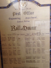 THE TRIBUTE WITHIN THE MAIN TELEPHONE EXCHANGE TO THOSE EMPLOYEES OF THE CARLISLE POST OFFICE ENGINEERING DEPARTMENT WHO SERVED IN THE GREAT WAR