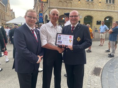 Returning in time to get changed for The Last Post Association service at The Menin Gate at 8:00 pm, our wreath was laid with the Standard on parade alongside a Canadian pipe band. We presented our CoA to the Last Post Association after the service, which they seemed thrilled with.