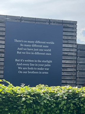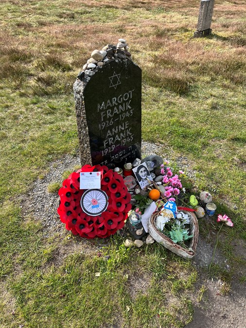 We arrived there at 17:45, and as it closes daily at 18:00, it wasn’t appropriate to enter the museum (which is well worth a visit). Instead, I took a couple of leaflets and we paid our respects at Anne Frank’s grave. Chris had researched poems from Bergen Belsen, and chosen one to be read here during the previous RBL Bike to Berlin in 2022. He was unable to deliver it then, but did so with us.