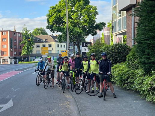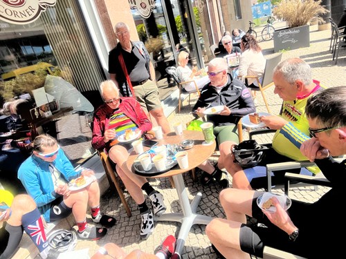 Then, a few meters further down the road, Nigel had a puncture. Those that were with him stayed to help get it sorted, so help with closing the gap with the group. Luckily, although this was a Continental tyre and reputedly horrendous to remove and particularly to refit, Chris was able to do the latter bare-handed! But a few more miles on and the same wheel punctured again, luckily just beside a bus stop. This time, we stayed together to see it fixed - and the thorn was found, this time. Nigel gave it his best effort to refit the tyre, but had to hand it to Chris to do. Who, as Nigel was pumping it back up, made a loud explosive noise - and everyone jumped out of their skins - even a passing German cyclist. But at least there were no more punctures.