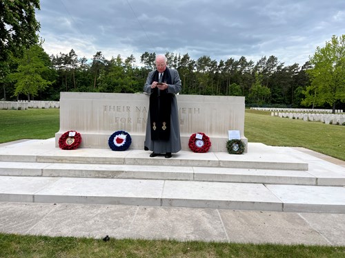 Lunch at a bar in Esquelbecq was saved by Lawrence’s quick thinking of going to the only open store and getting some filled baguettes; 1st May is a bank holiday in France and most places were closed. A km further, we laid our wreath at the Wormhoudt Massacre Barn, with Standard dipped and Exhortation recited.