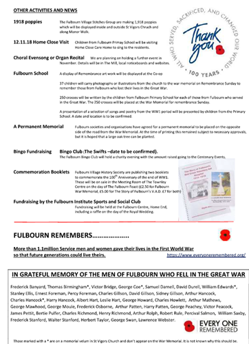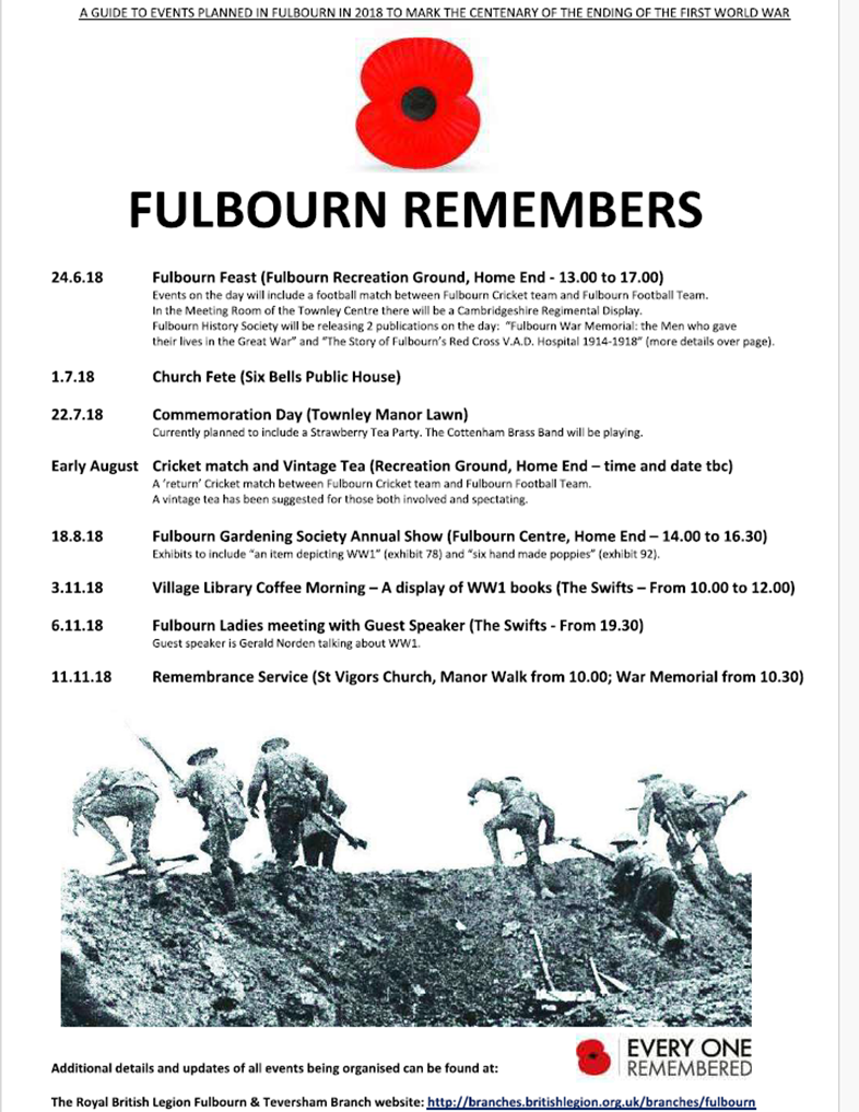 Fulbourn Remembers Fulbourn Remembers The branch led a number of events in 2018 as part of the commemoration of 100 years of the ending of World War 1.
