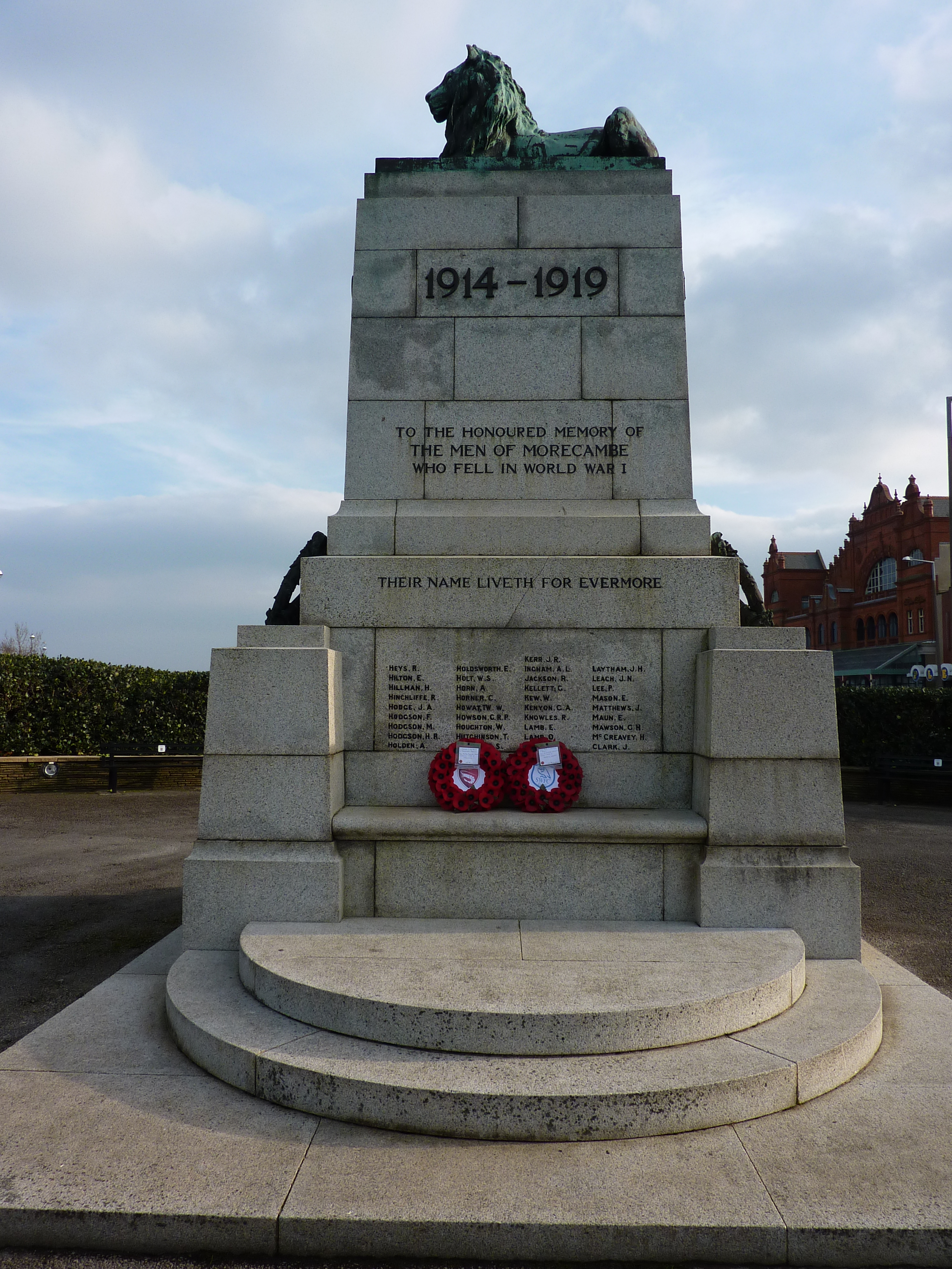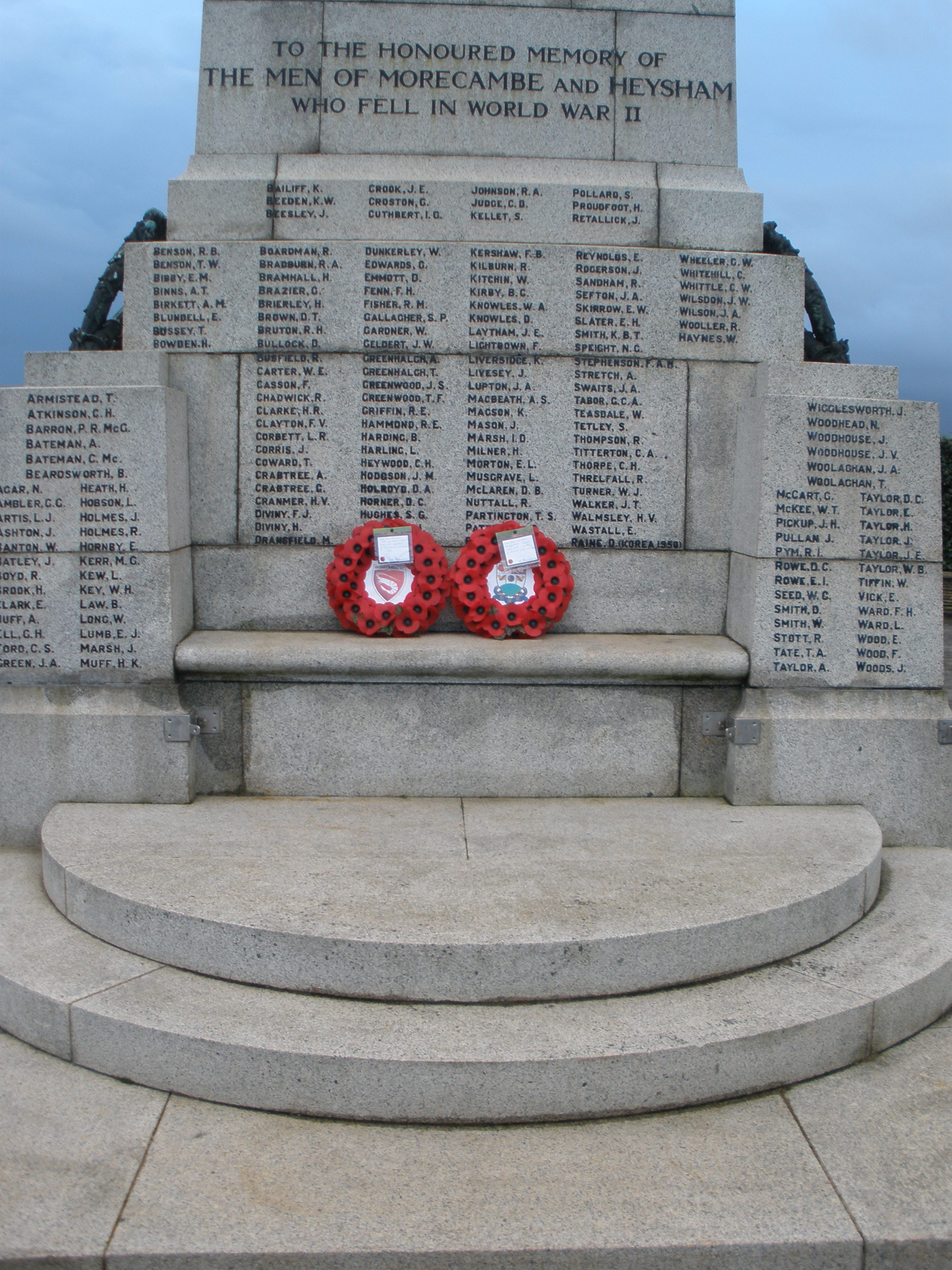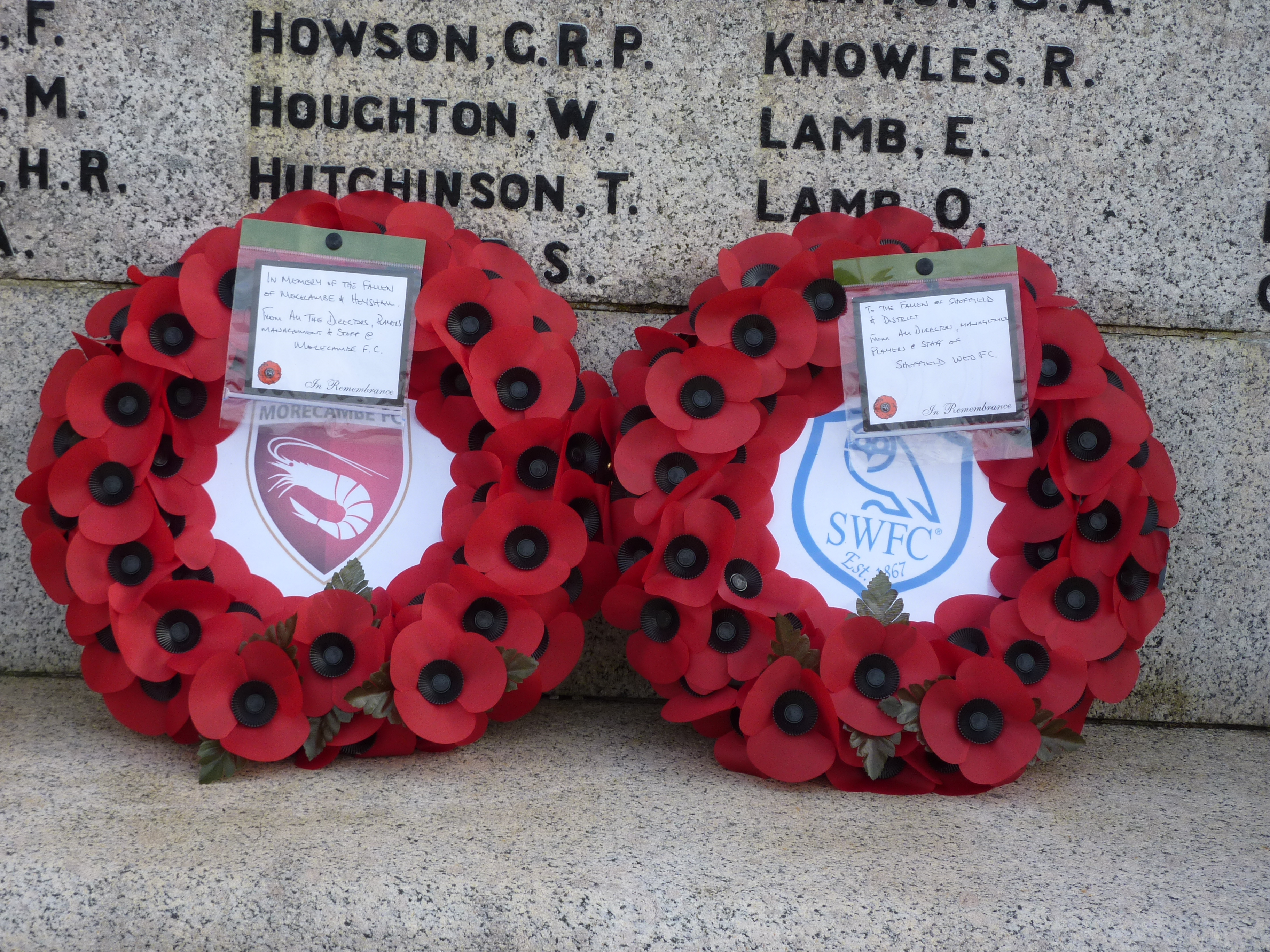 In 2011, a similar ceremony took place at the Globe Arena when Morecambe FC played Sheffield Wednesday FC in the First Round of the FA Cup on the afternoon of Remembrance Sunday and Morecambe were narrowly defeated by two goals to one. The Wreaths laid on the Centre Spot by the Team Captains prior to the game were later placed on the Morecambe Cenotaph. Click here to view the Cenotaph and here for a close-up of the Wreaths showing the Team Crests.