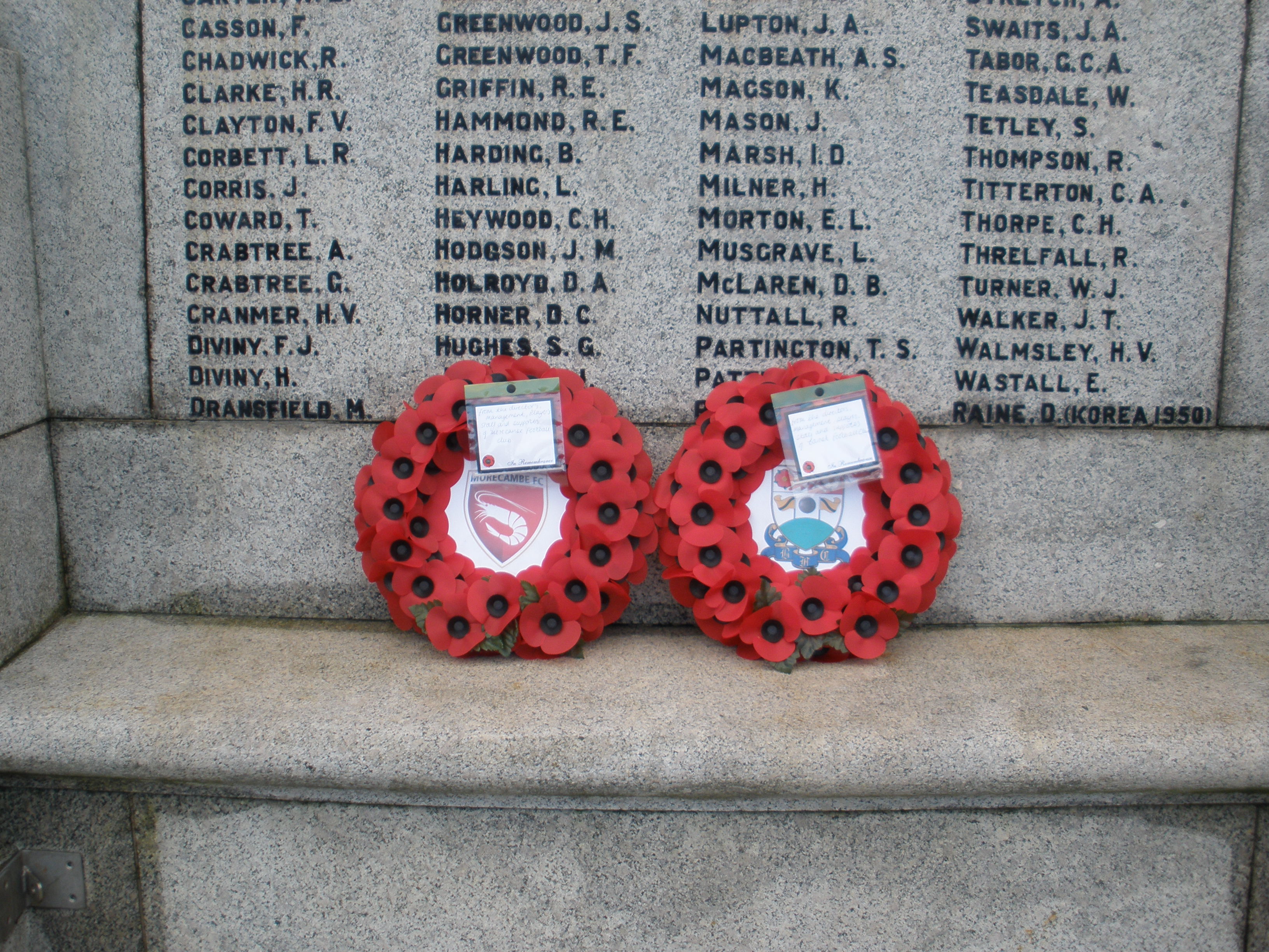 The two Wreaths laid on the Centre-Spot by the Team Captains were subsequently laid on Morecambe Cenotaph.