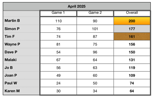 There were empty lanes and plenty of space to come along and join us, so you know what to do in May. See you there, and it could be you taking the trophy home for the month.