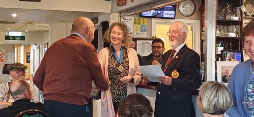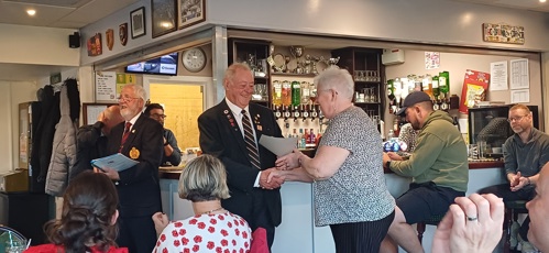 Here, Terry Murphy, their Challenge Organiser, and a colleague present their cheque for £3000 at the Branch Poppy Appeal Party afterwards.