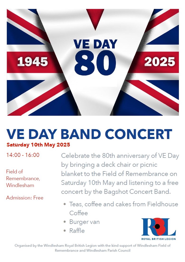 To celebrate the 80th Anniversary of VE Day, the Branch will be holding a Band Concert and Picnic at the Field of Remembrance on Saturday 10th May. Full details on the poster below.