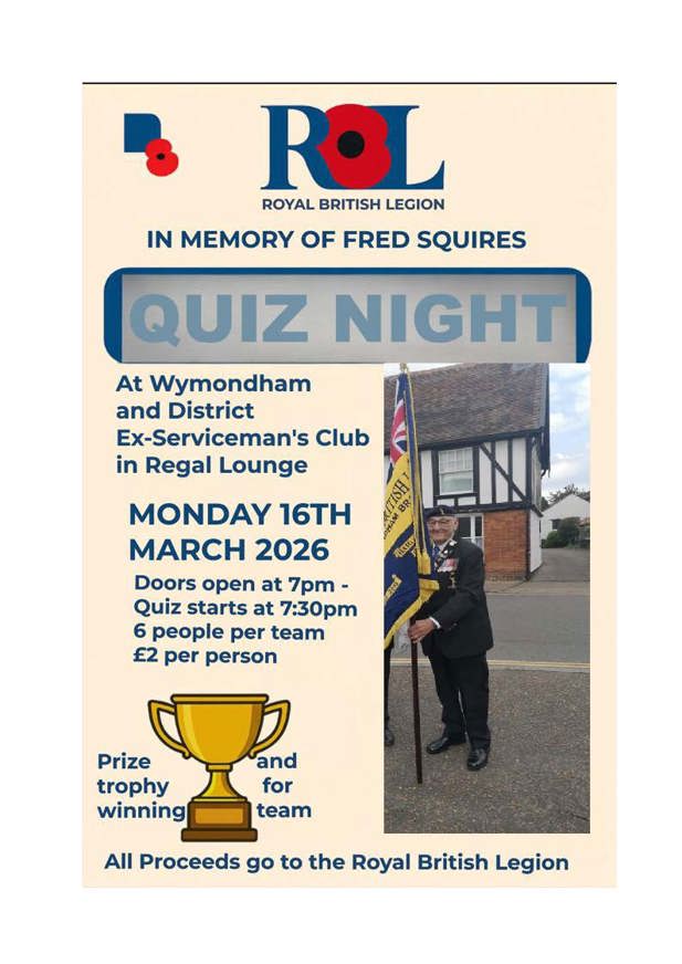 Quiz Night - Monday 16th March Join us to remember our former branch President and long time member, Fred Squires. Doors open at 7pm, quiz starts at 7.30pm. 6 people per team, £2 per person.