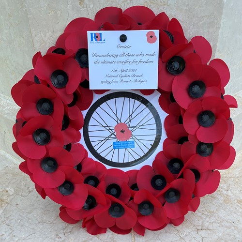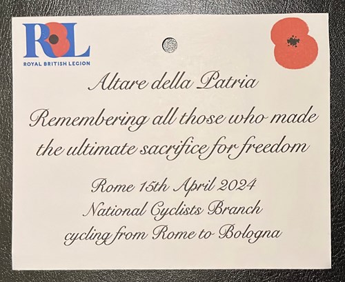 I obtained permission to lay a wreath here from Lt Col Cristiano De Ianni, Chief of Protocol in the High Operational Command in Rome only 2 days before setting off. As my Italian isn’t the best, and Google Translate didn’t help much, I replied suggesting what I hoped the authorisation included reciting “The Exhortation”, dipping a Standard, Last Post, ending with a silent tribute. He replied that no, it was for laying a wreath only. My National Cyclists Branch Standard was a banner, and they aren’t allowed. Anyway, it was a 25 minute walk from the hotel, so we set off in good humour; bikes in the hotel reception; luggage in our rooms; all good.
