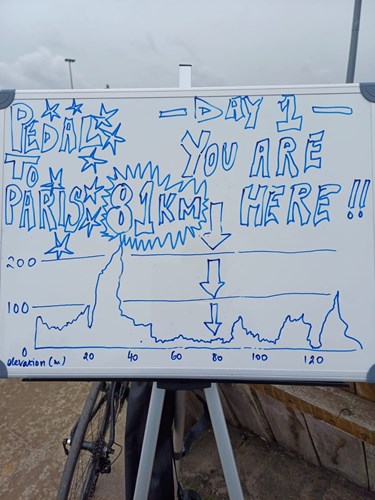 Day 1, a very early start as Lorna Burrows sets off on the 2023 RBL Pedal to Paris. First day London to Dover approx 86 miles before catching the ferry to Calais. In Calais, only a short ride to the overnight stop and a well-deserved rest before Day 2!