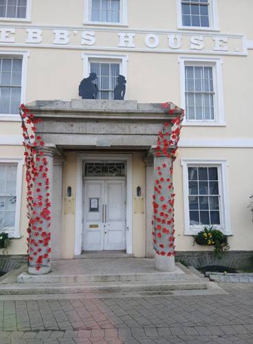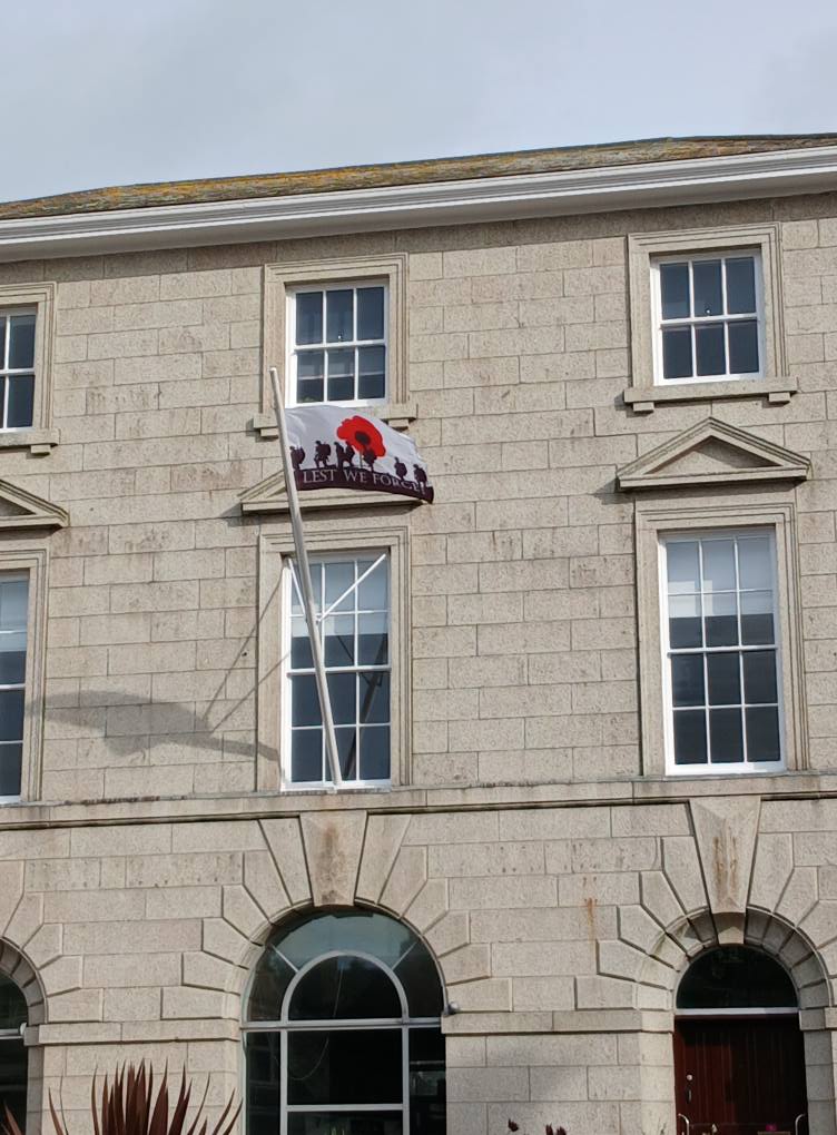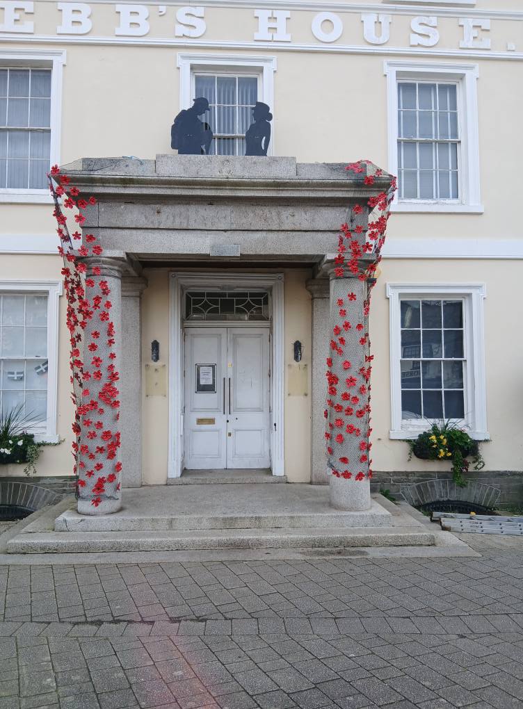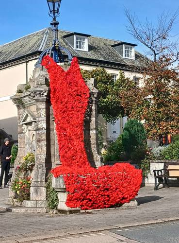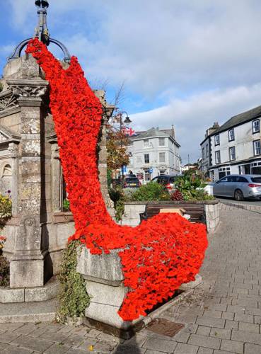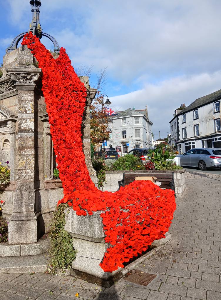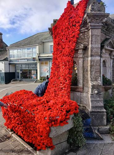 The knitted poppies have come in from all quarters - the Sewing Groups, the Knit and Natter group, the U3A, many individuals who enjoy the activity, and they are still coming in for us to take further next year. The mammoth task from nimble fingers tying on the poppies has been done by many individuals, in the Liskerret Centre to whom we thank hugely, so the end result is a real community spirited project. Huge thanks to the Scout team who were happy to climb ladders for us as well as put up their display again at Webbs. And to Boost House for letting us fly the flag.