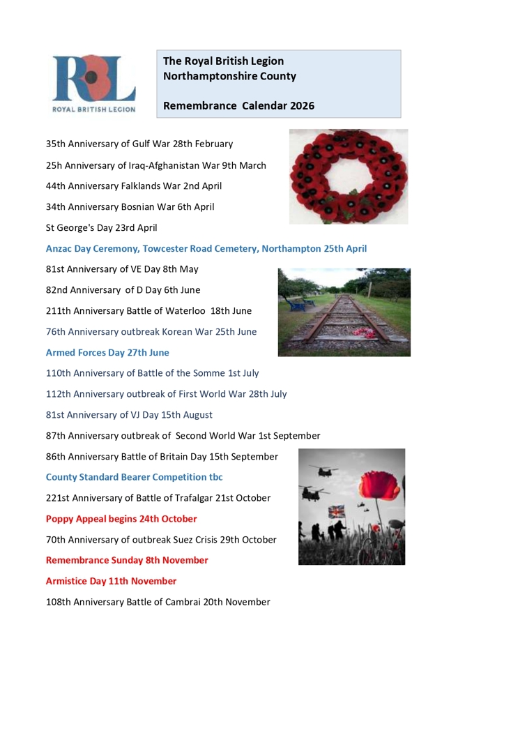 The following is a list of key dates when Remembrance activities may be planned both nationally and in Northamptonshire during 2026: