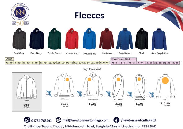 Prices can be seen below (supplied by Newton and Newton). Basically £18 for a fleece + £6 for WS artwork/name/branch etc on chest, as seen above + £6 for WS artwork on Sleeve if wanted = £6, £12 or £18. Sizes are further explained below.